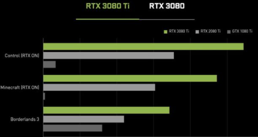 在幾個(gè)游戲中,英偉達(dá)給出了不同顯卡的性能對比,RTX3080Ti的性能是RTX2080Ti的1.5倍。