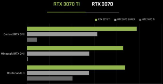 RTX3070Ti的性能是RTX2070Super的1.5倍,是GTX1070Ti的2倍。