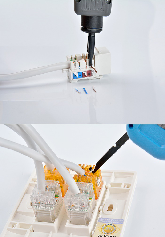 1.先將雙絞線剝皮,露出里面的八股線,然后使用單對110型打線刀,根據(jù)配線架的標(biāo)識用110型打線刀將雙絞線線序準(zhǔn)確的壓入配線架中(配圖演示為模塊但原理相同)。