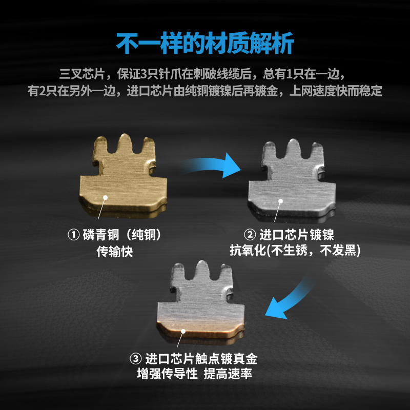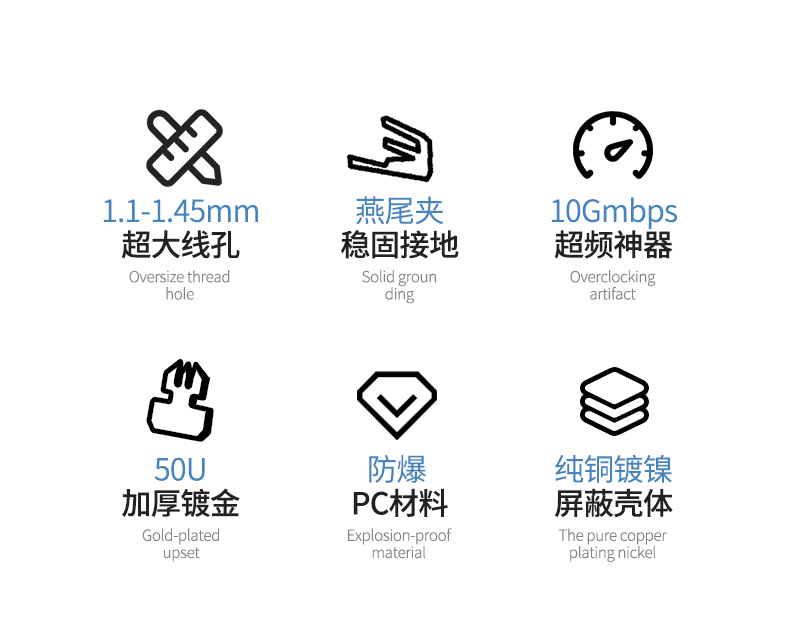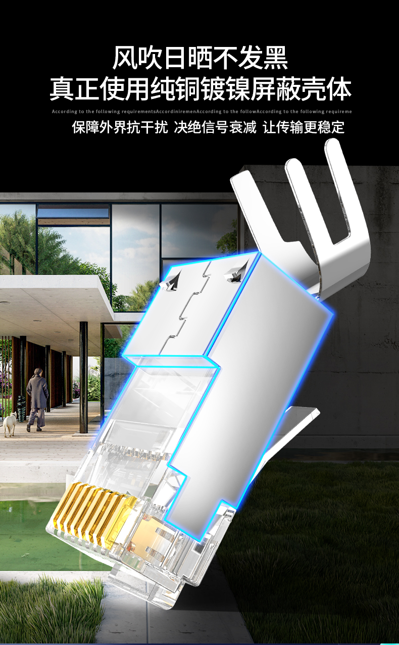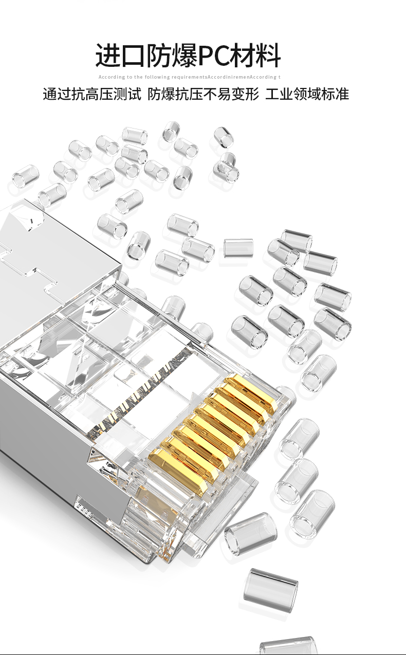 奧卡斯七類屏蔽水晶頭傳輸性能超過七類標(biāo)準(zhǔn);采用鋅合金外殼;優(yōu)質(zhì)阻燃PC料, 阻燃符合UL94V-2,安全可靠;50μ鍍金針片,抗氧化,抗老化能力強,阻抗超低;接線更牢靠,傳導(dǎo)性更強,不易脫落,與模塊接觸使衰減降至最低程度