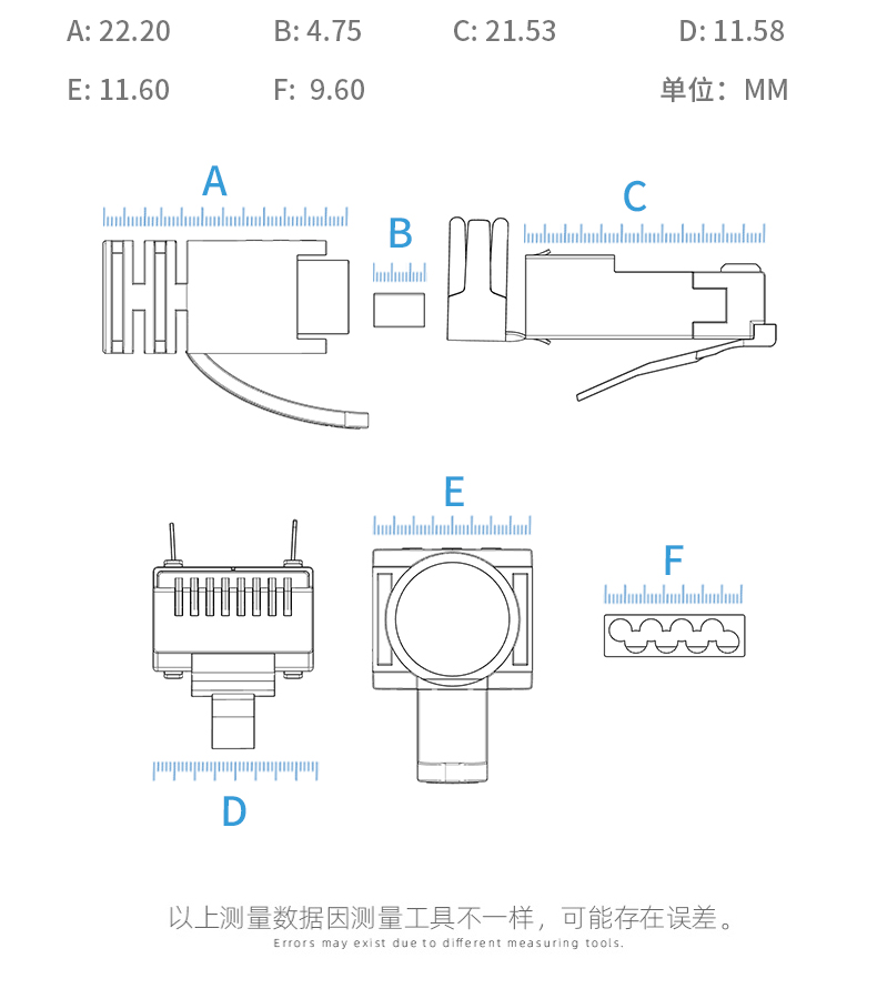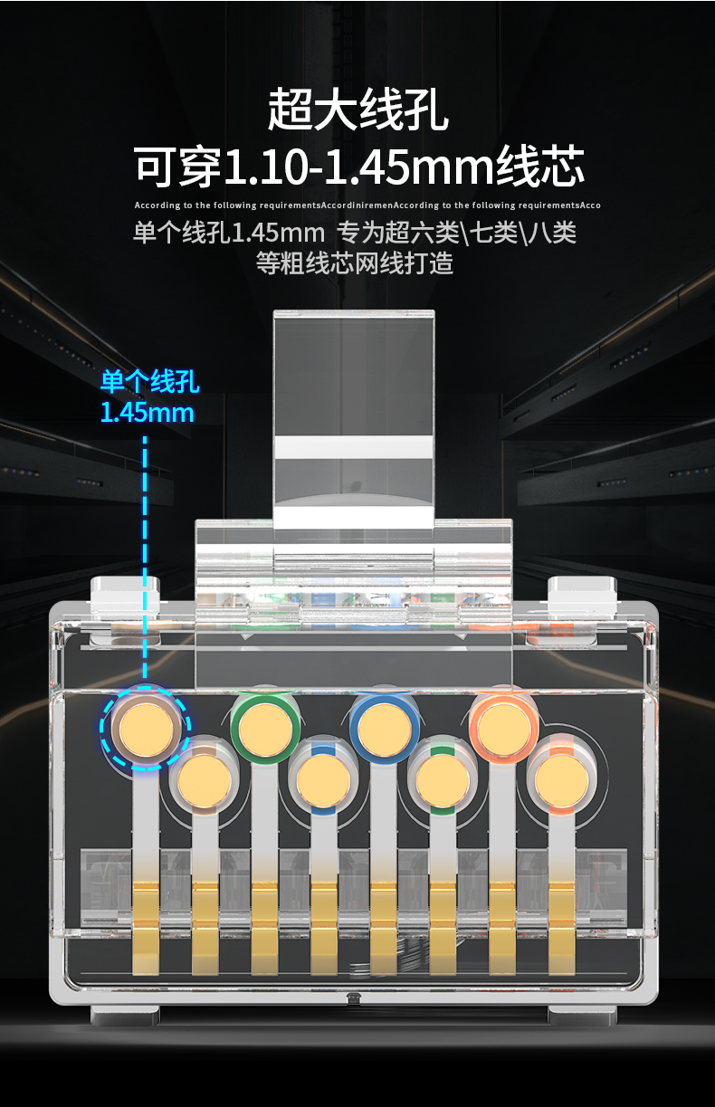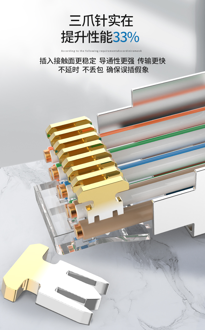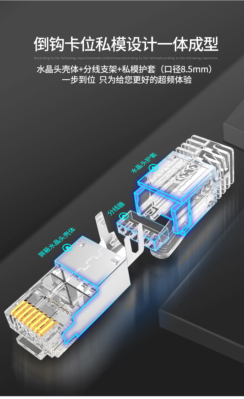 奧卡斯七類屏蔽水晶頭傳輸性能超過七類標(biāo)準(zhǔn);采用鋅合金外殼;優(yōu)質(zhì)阻燃PC料, 阻燃符合UL94V-2,安全可靠;50μ鍍金針片,抗氧化,抗老化能力強,阻抗超低;接線更牢靠,傳導(dǎo)性更強,不易脫落,與模塊接觸使衰減降至最低程度
