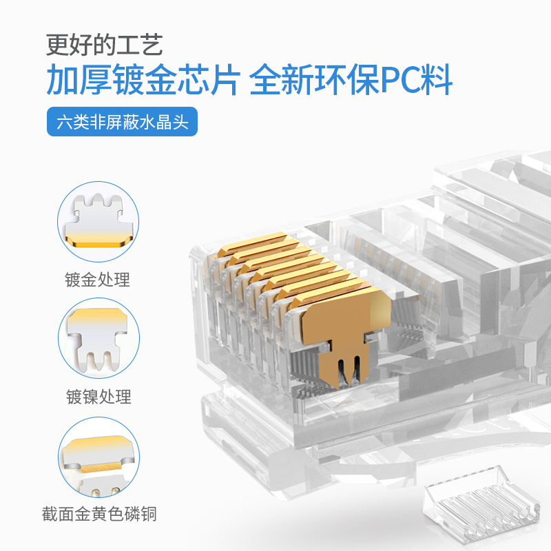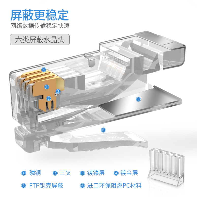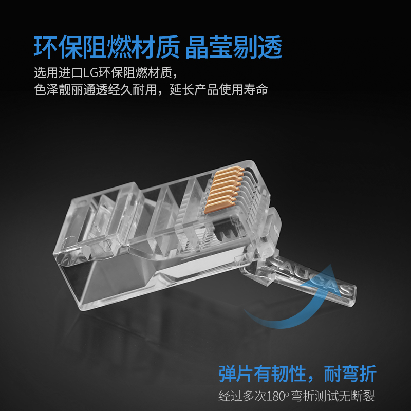 奧卡斯超六類水晶頭傳輸性能超過超六類標準;優(yōu)質(zhì)阻燃PC料, 阻燃符合UL94V-2,安全可靠;50μ鍍金針片,抗氧化,抗老化能力強,阻抗超低;接線更牢靠,傳導性更強,不易脫落,與模塊接觸使衰減降至最低程度