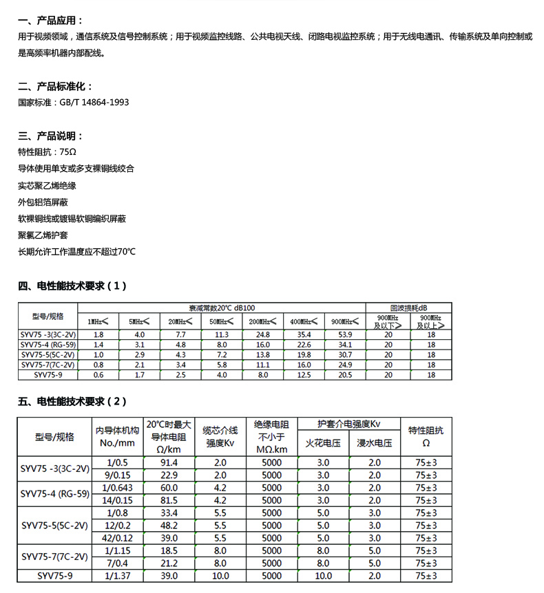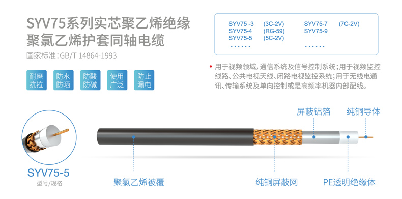 用于視頻監(jiān)控線路、公共電視天線、閉路電視監(jiān)控系統(tǒng);用于無線電通訊、傳輸系統(tǒng)及單向控制或 是高頻率機器內(nèi)部配線