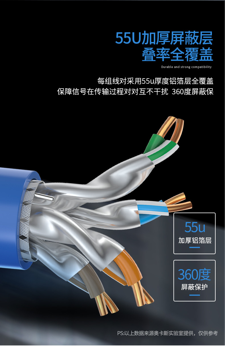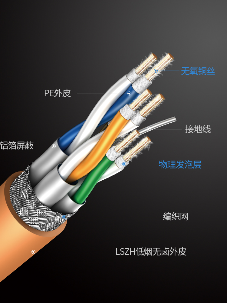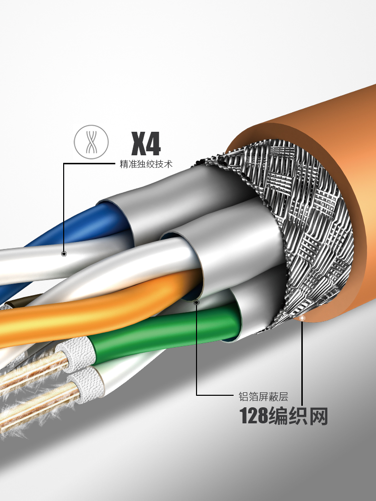 采用物理發(fā)泡工藝,128編織網(wǎng)+鋁箔雙屏蔽層,可達(dá)萬(wàn)兆速率,600HMz-1000HMz帶寬超爽體驗(yàn)。