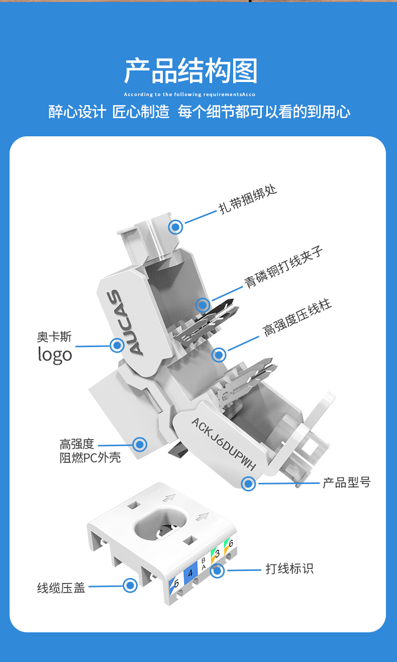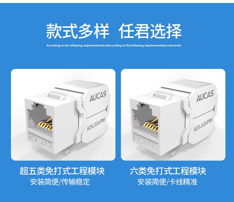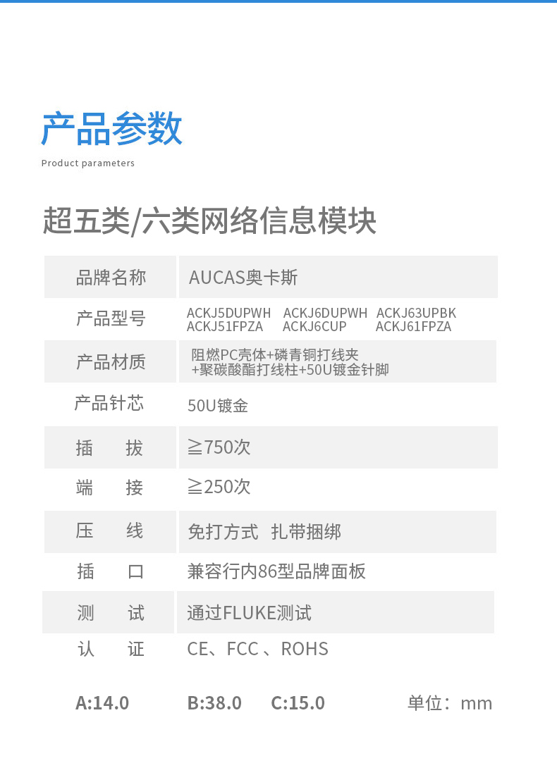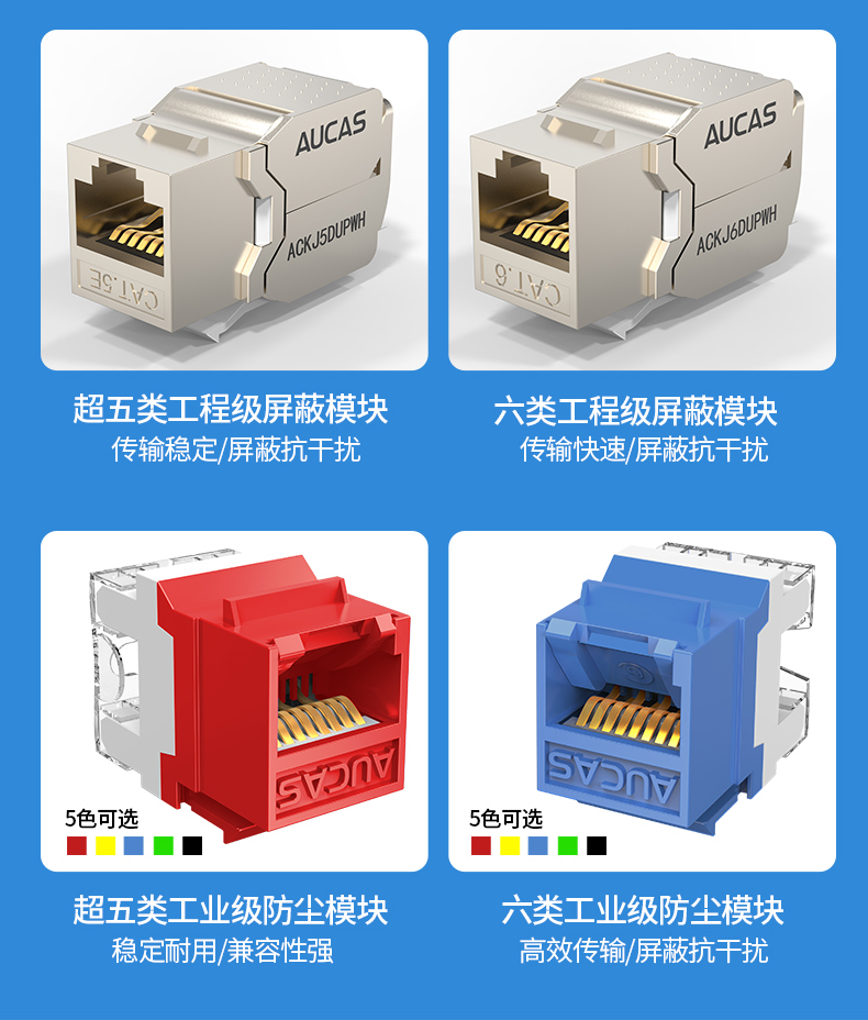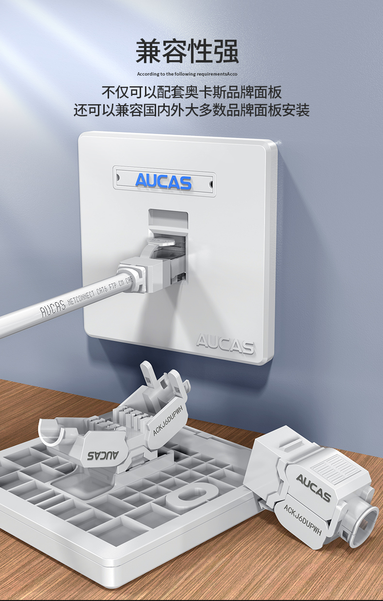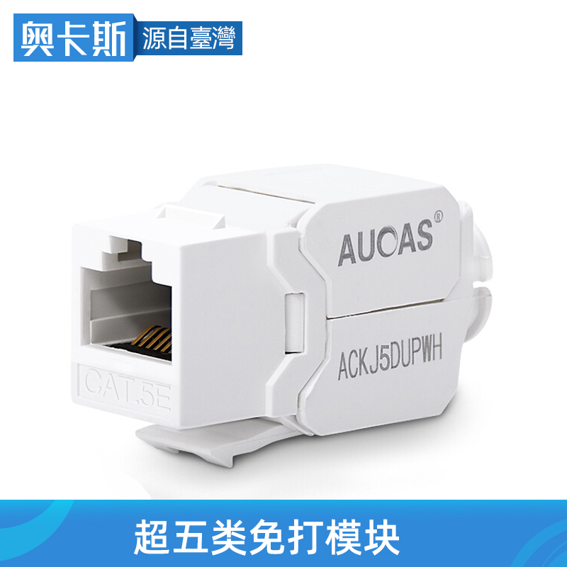 AUCAS(奧卡斯) Cat.5e局域網(wǎng),傳輸語言、數(shù)據(jù)信號,支持當前的高帶寬應用,可以安裝到墻面信息面板上,固定在桌面信息盒中或模塊化配線架上,并可插拔RJ11/RJ45。