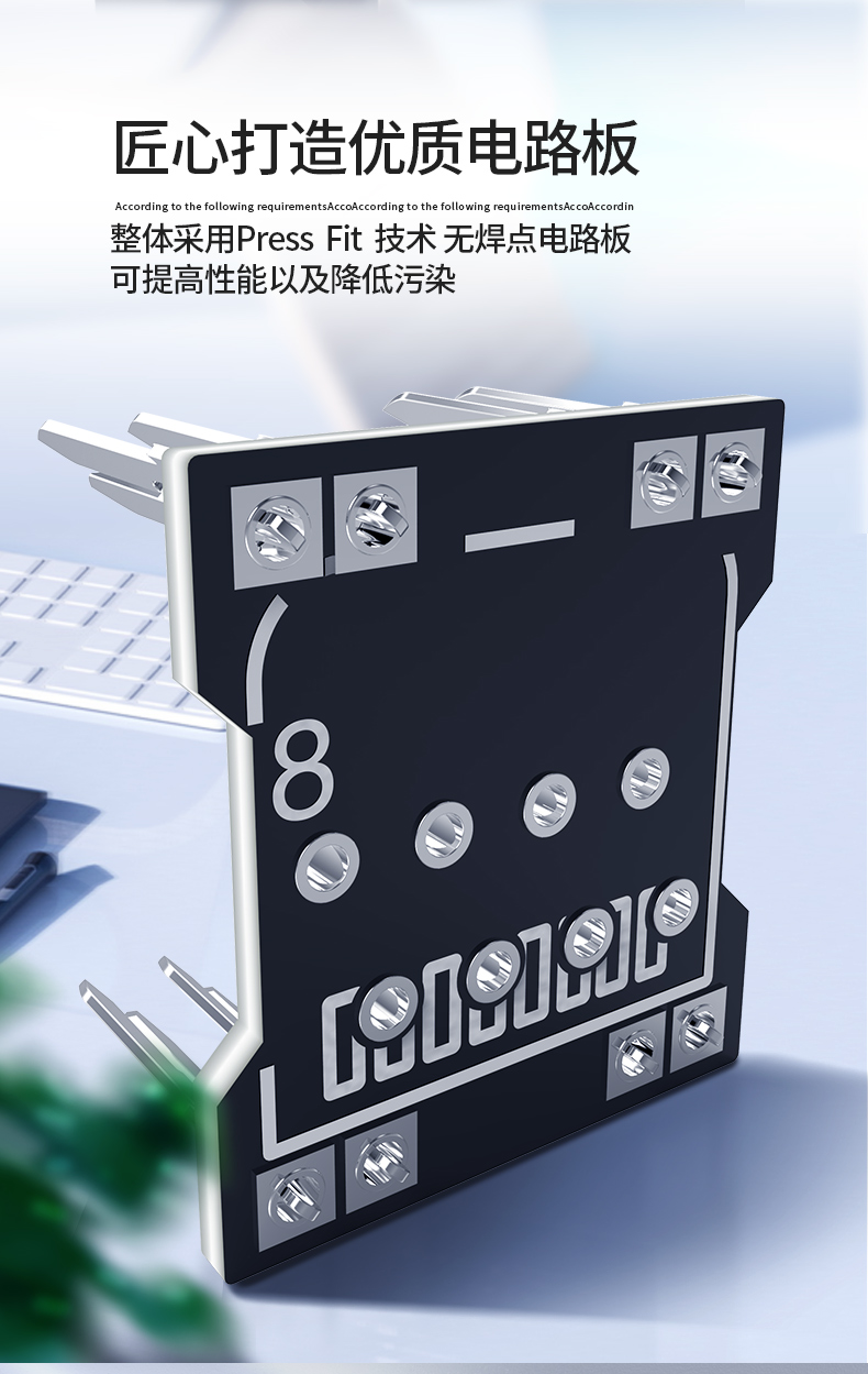 整體采用Press Fit技術(shù),無焊點電路板,可提高性能及降低污染。 通過TLC認證,保證NEXT值超越ANSI/TIA 568 .2-D Cat.5e的要求,及六點連接Channel測試認證。