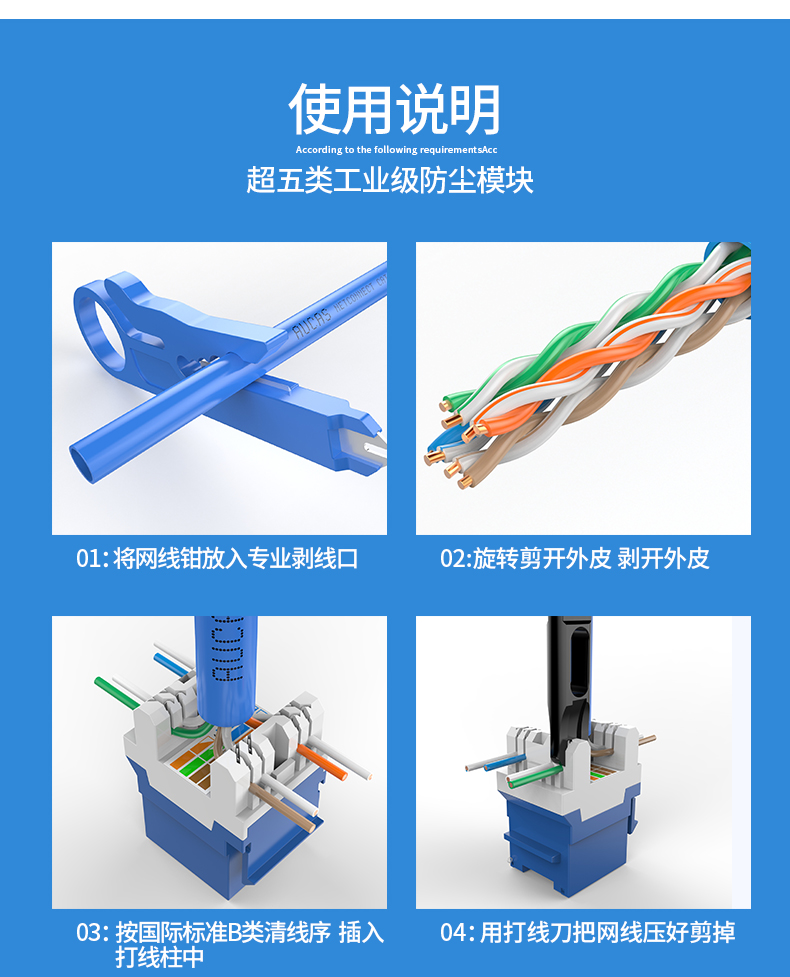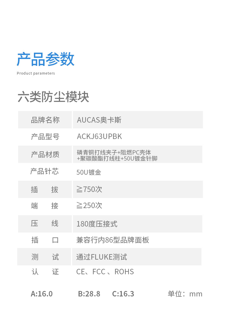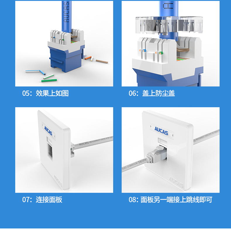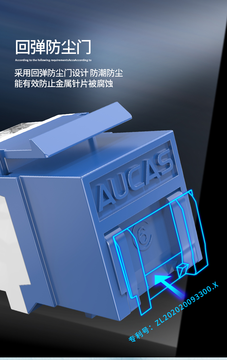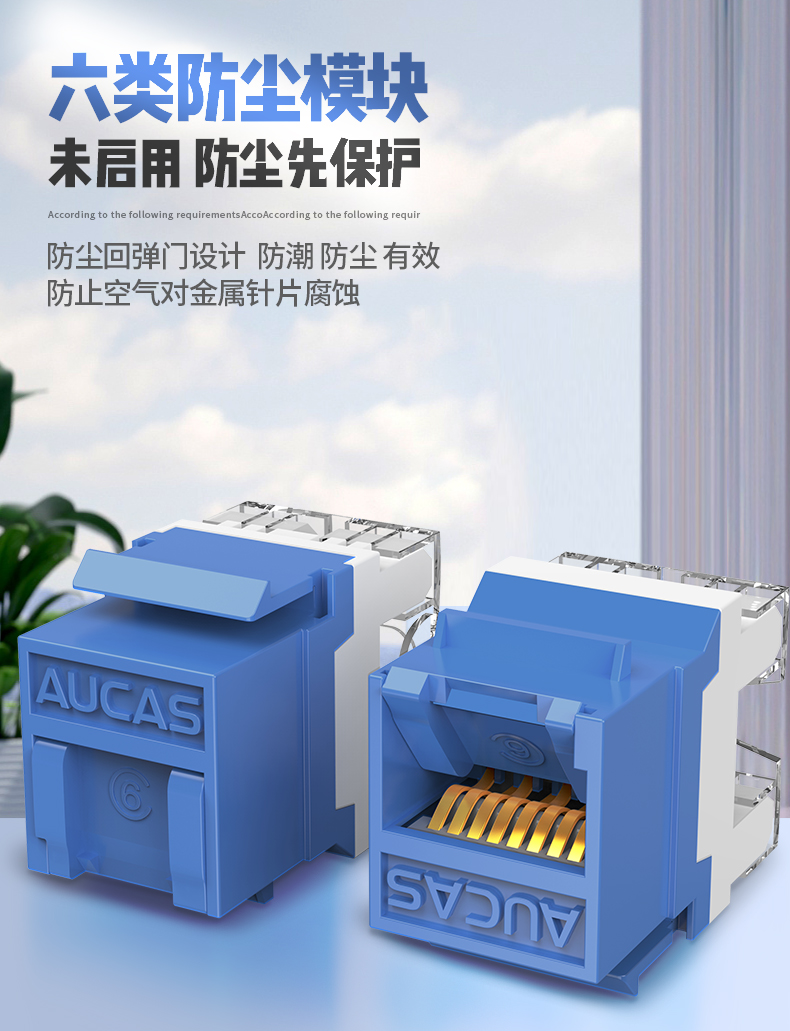 AUCAS(奧卡斯) Cat.6局域網(wǎng),傳輸語言、數(shù)據(jù)信號,支持當前的高帶寬應用,可以安裝到墻面信息面板上,固定在桌面信息盒中或模塊化配線架上,并可插拔RJ11/RJ45。