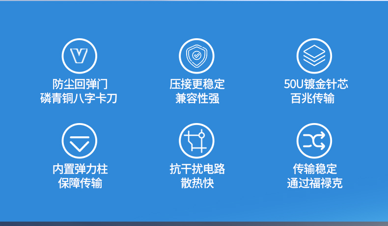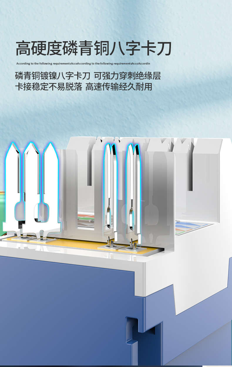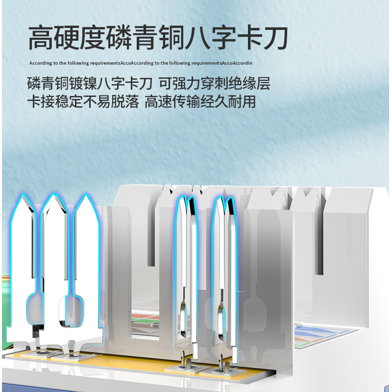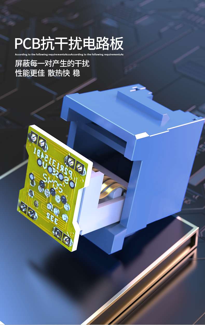 整體采用Press Fit技術,無焊點電路板,可提高性能及降低污染。 通過TLC認證,保證NEXT值超越ANSI/TIA 568 .2-D Cat.5e的要求,及六點連接Channel測試認證。