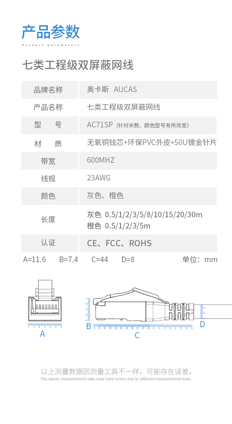 奧卡斯七類屏蔽跳線,速率可達萬兆,頻率達600MHz。主要作為監(jiān)控、語音、數(shù)據(jù)、多媒體等的傳輸載體,用于工作區(qū)插座與設(shè)備端口的連接以及配線架或中心機房內(nèi)模塊插座與設(shè)備的連接,完全滿足E級鏈路的應(yīng)用需求。