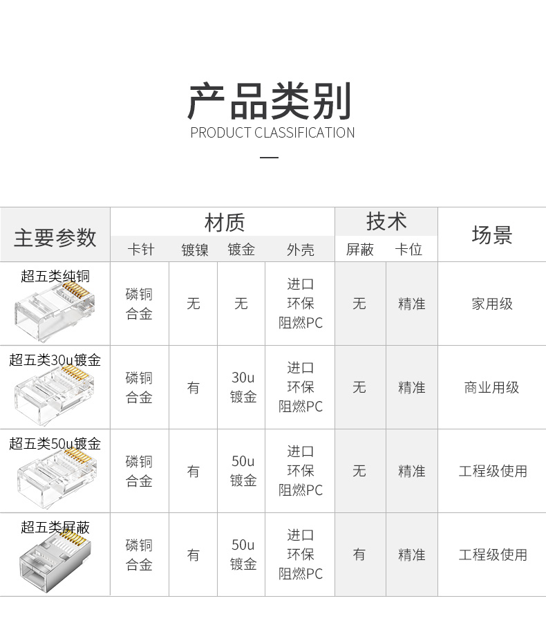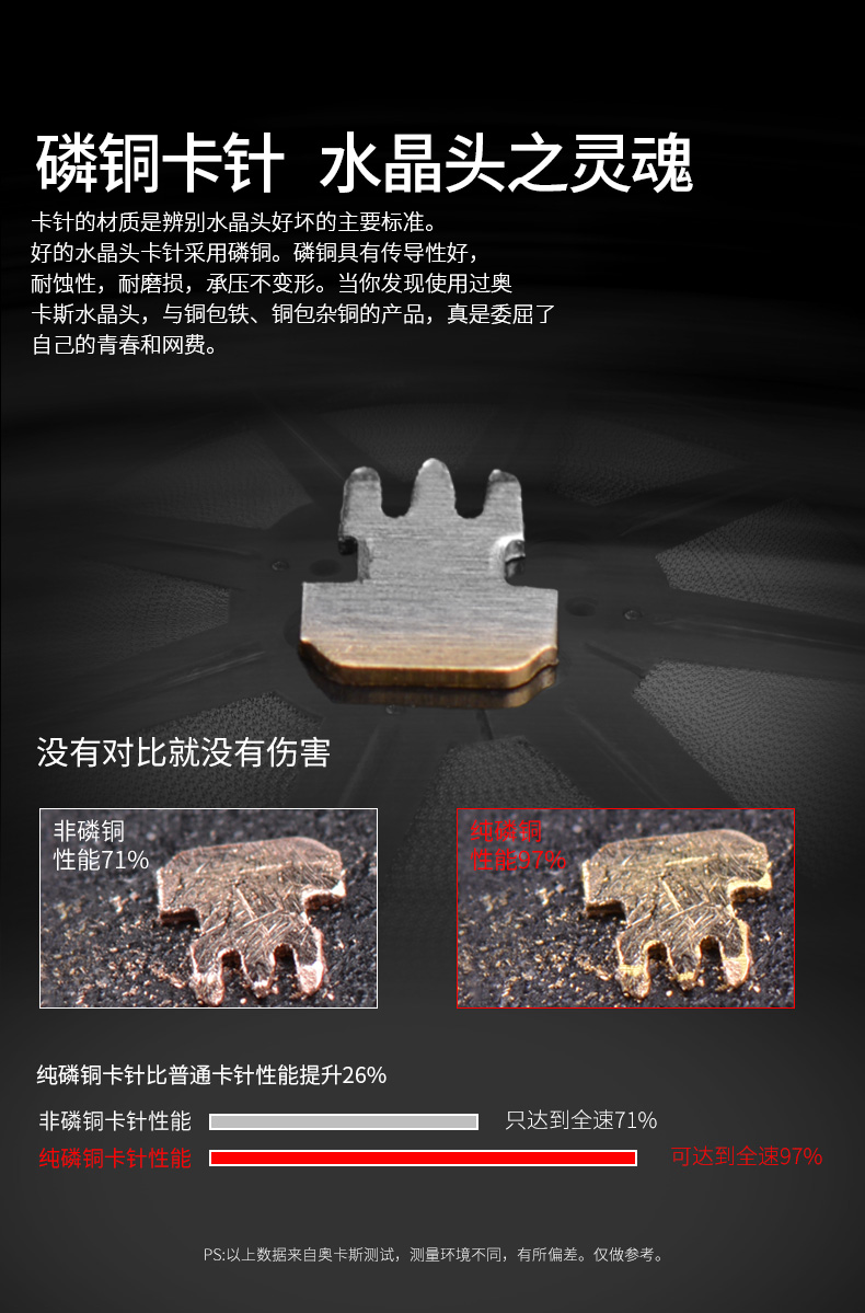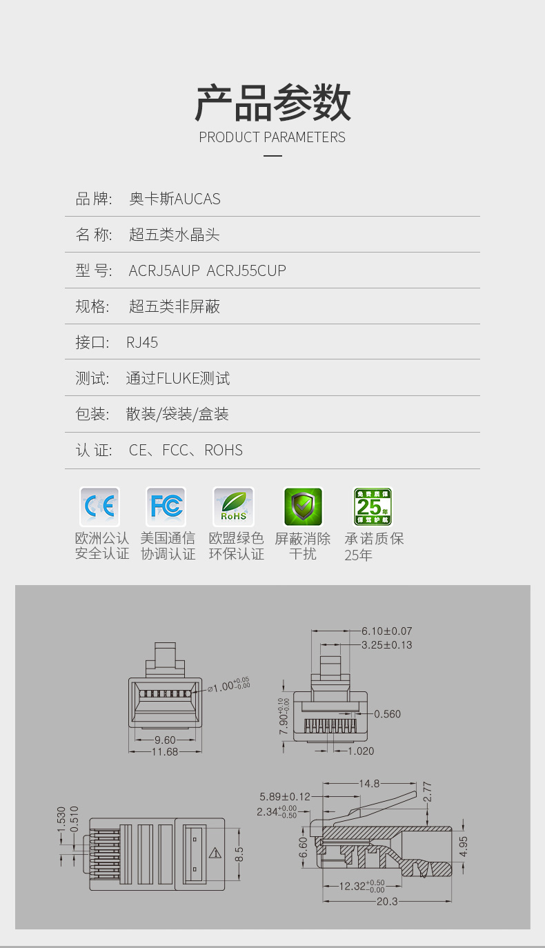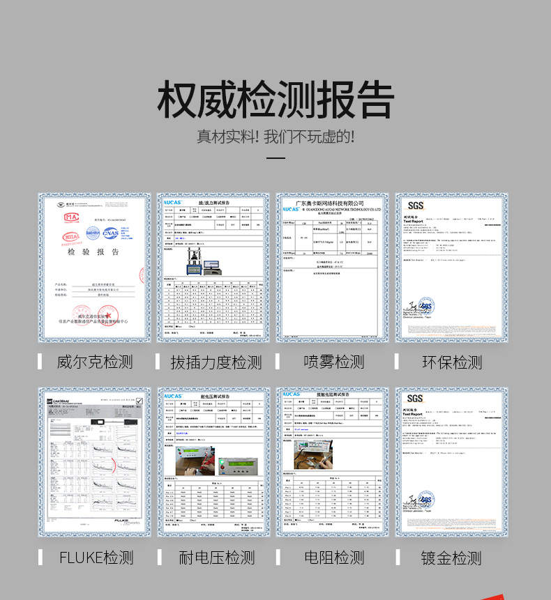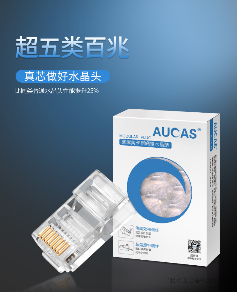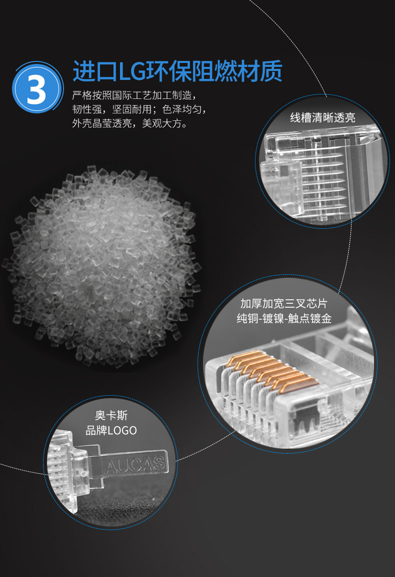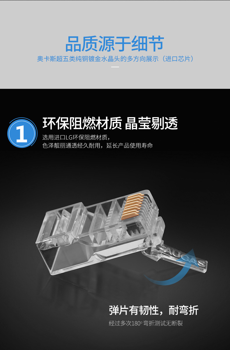 奧卡斯超五類屏蔽水晶頭傳輸性能超過超五類標(biāo)準(zhǔn);采用鋅合金外殼;優(yōu)質(zhì)阻燃PC料, 阻燃符合UL94V-2,安全可靠;50μ鍍金針片,抗氧化,抗老化能力強,阻抗超低;接線更牢靠,傳導(dǎo)性更強,不易脫落,與模塊接觸使衰減降至最低程度