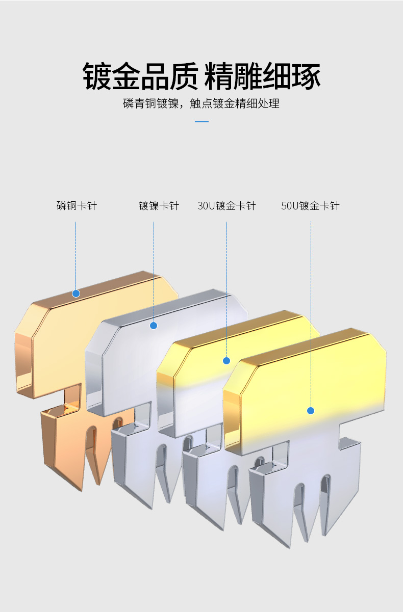 塑膠殼采用優(yōu)質(zhì)透明PC料,金片采用磷銅合金,鍍鎳后再鍍金,厚度達0.35mm