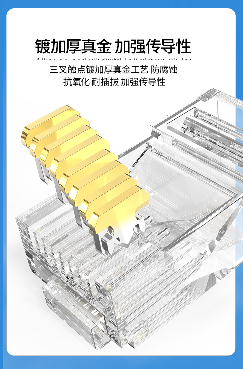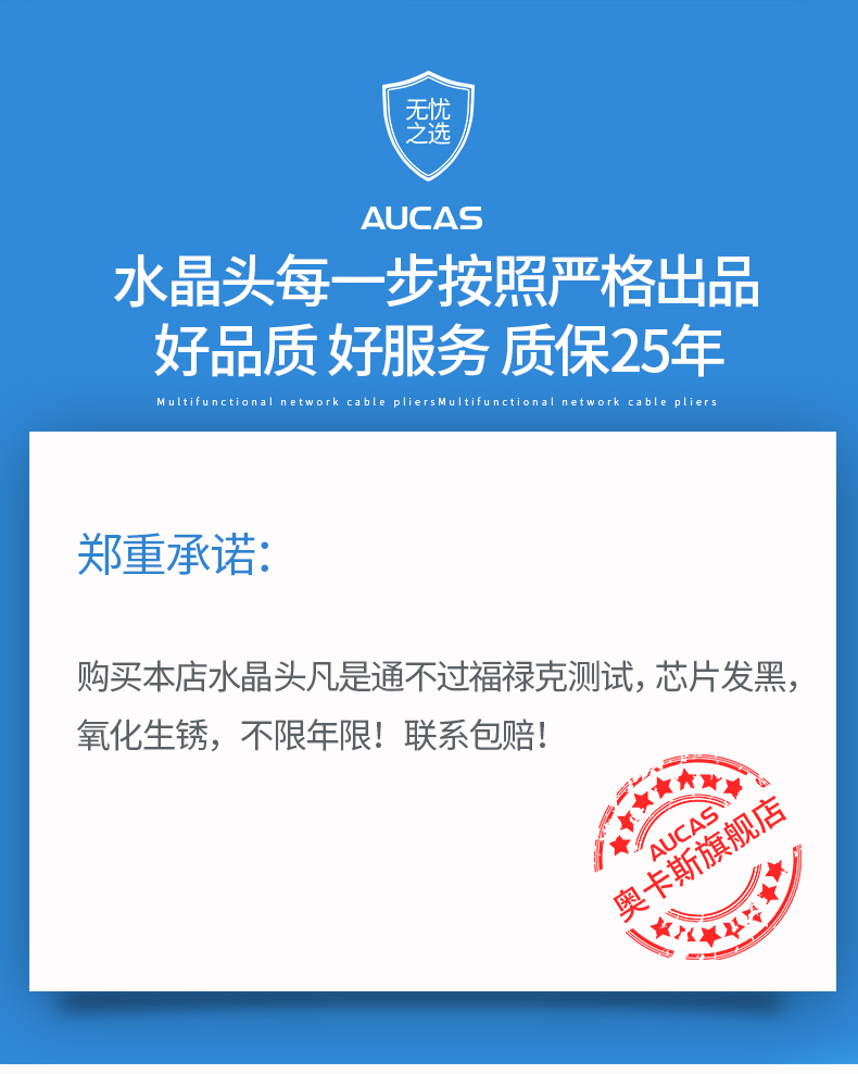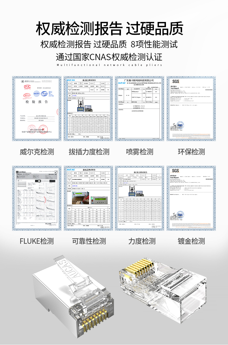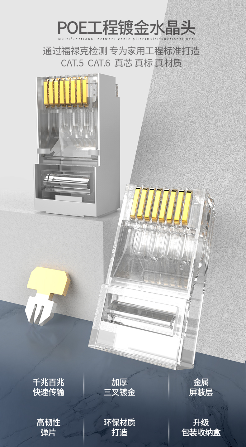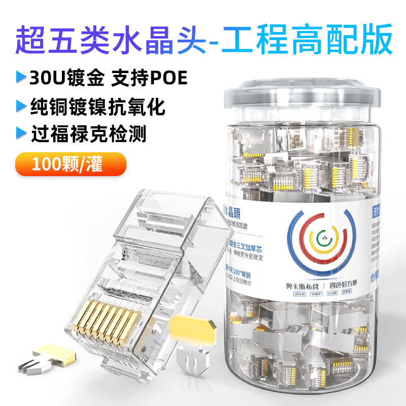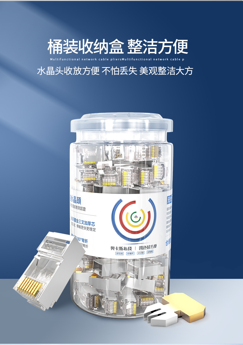 奧卡斯超五類屏蔽水晶頭傳輸性能超過超五類標準;采用鋅合金外殼;優(yōu)質阻燃PC料, 阻燃符合UL94V-2,安全可靠;50μ鍍金針片,抗氧化,抗老化能力強,阻抗超低;接線更牢靠,傳導性更強,不易脫落,與模塊接觸使衰減降至最低程度