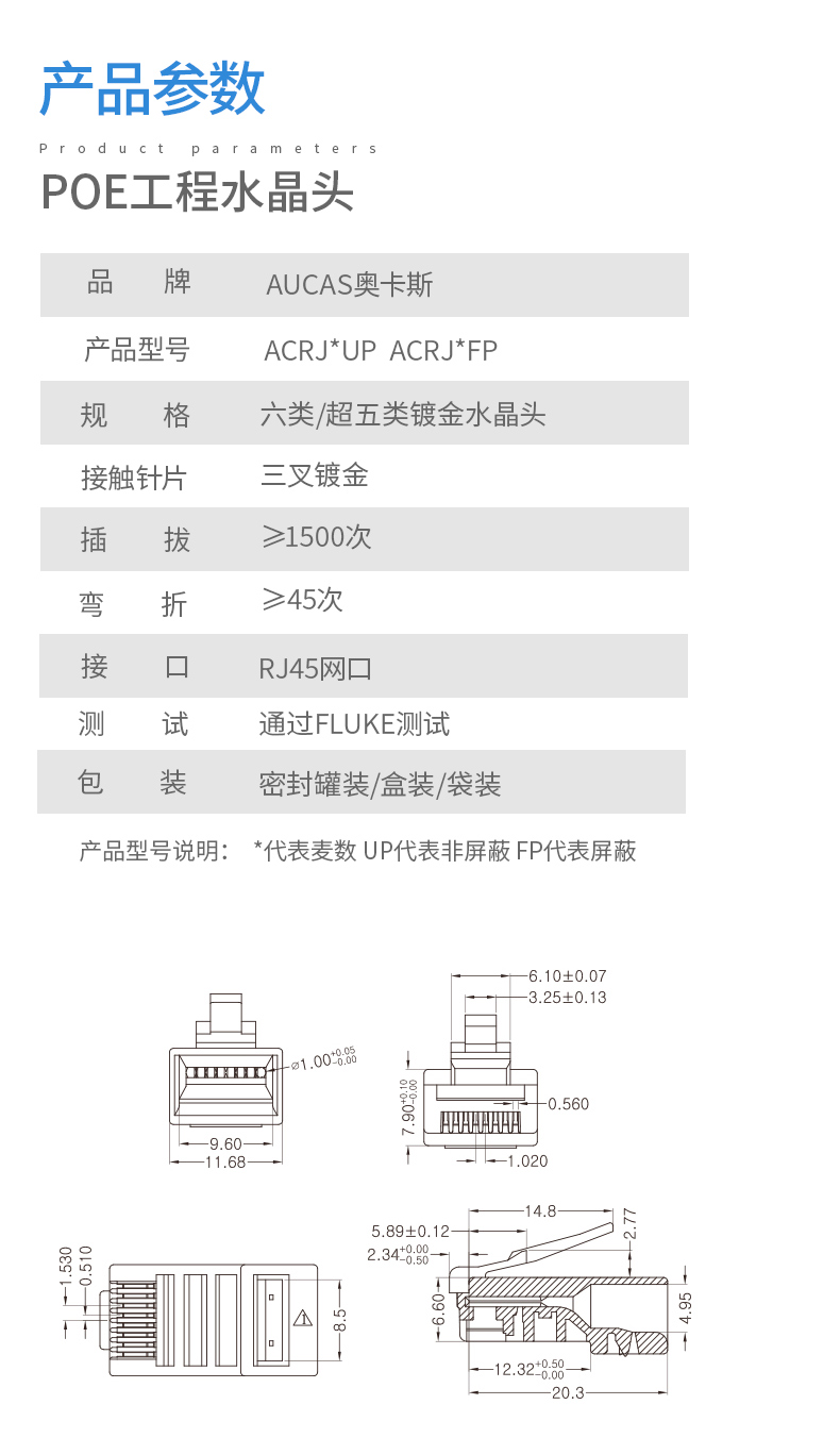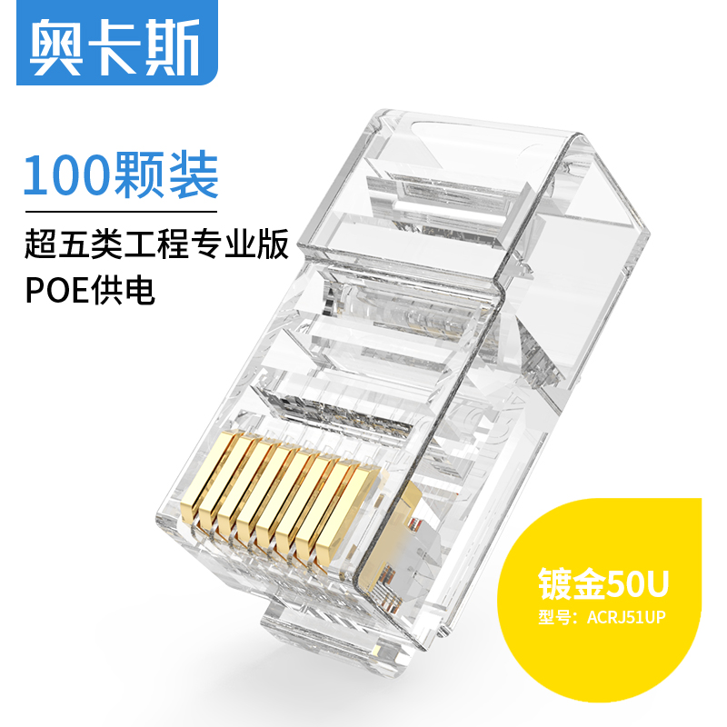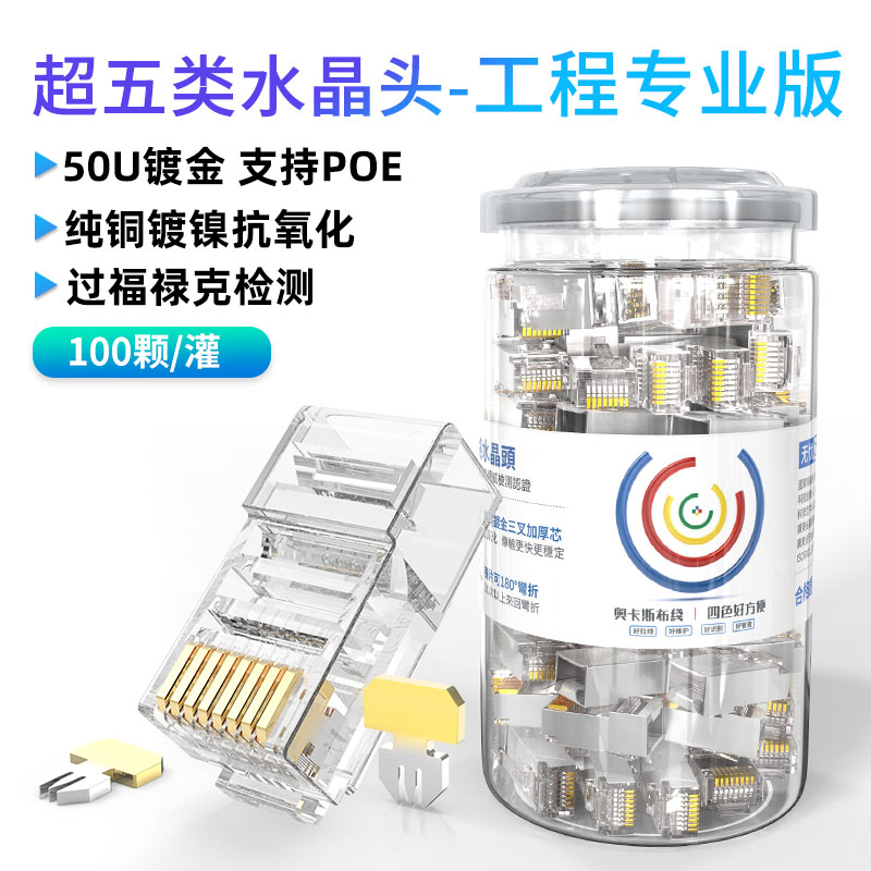 奧卡斯超五類屏蔽水晶頭傳輸性能超過(guò)超五類標(biāo)準(zhǔn);采用鋅合金外殼;優(yōu)質(zhì)阻燃PC料, 阻燃符合UL94V-2,安全可靠;50μ鍍金針片,抗氧化,抗老化能力強(qiáng),阻抗超低;接線更牢靠,傳導(dǎo)性更強(qiáng),不易脫落,與模塊接觸使衰減降至最低程度