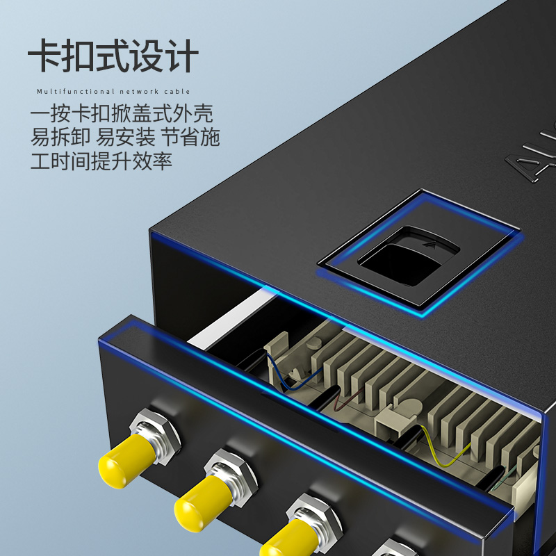 以高質(zhì)量的冷軋鋼板制作,表層靜電噴涂烤漆處理,外觀精美。通用型面板設(shè)計(jì),可安裝ST/ SC/ LC /FC等不同類型耦合器、易拆卸前蓋及上蓋扣設(shè)計(jì),免工具即可拆卸前蓋及上蓋板,裝卸更為容易