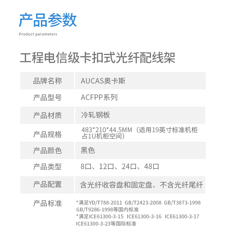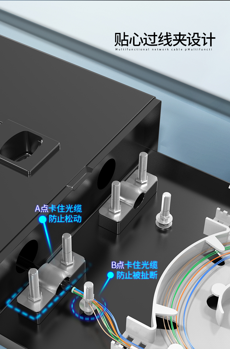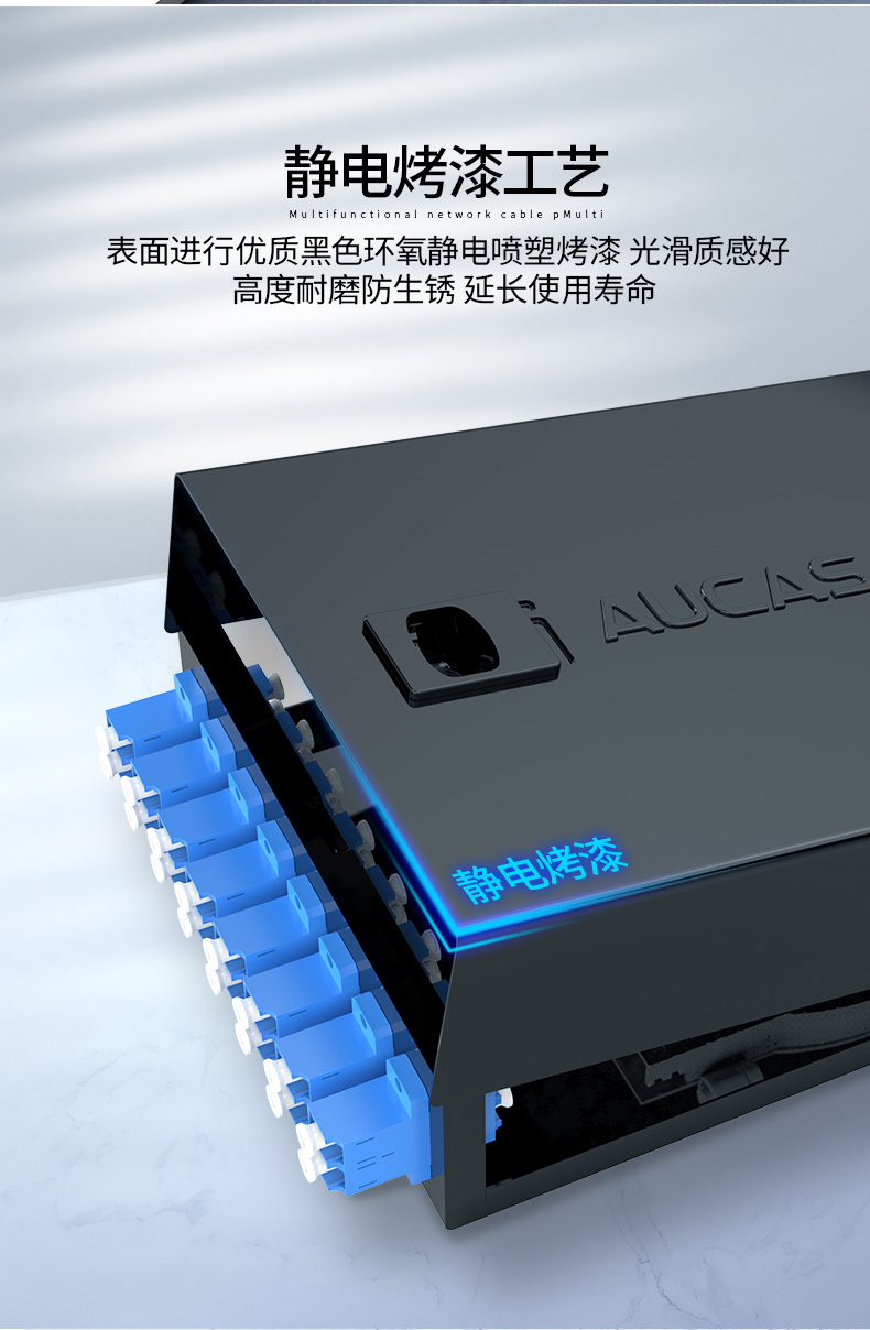 以高質(zhì)量的冷軋鋼板制作,表層靜電噴涂烤漆處理,外觀精美。通用型面板設(shè)計(jì),可安裝ST/ SC/ LC /FC等不同類型耦合器、易拆卸前蓋及上蓋扣設(shè)計(jì),免工具即可拆卸前蓋及上蓋板,裝卸更為容易
