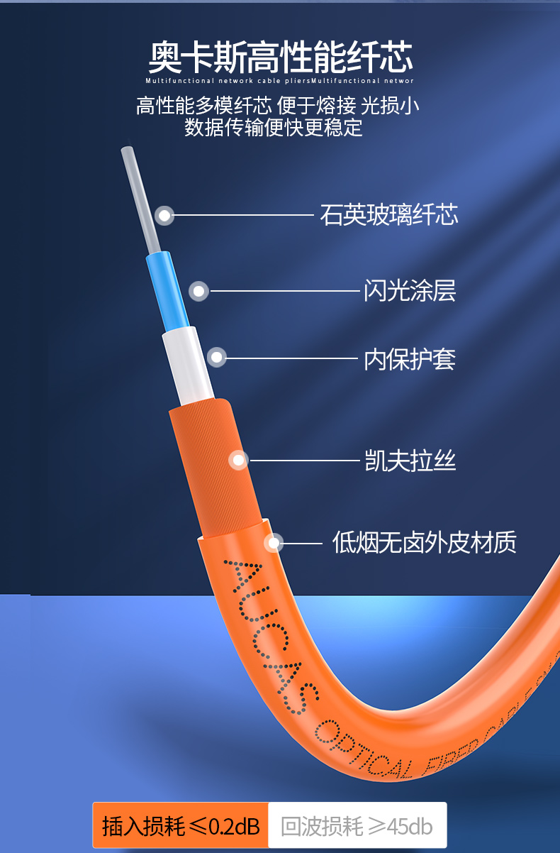 奧卡斯光纖跳線采用最先進的研磨技術和研磨設備,保證光纖的圓心研磨偏移,凹陷、表面無劃痕或瑕疵、陶瓷端面曲率半徑的大小等技術參數(shù)符合國際標準的規(guī)定; 插入損耗小、回波損耗大,互換性能,重復插撥性能優(yōu)良,使用方便; 提供數(shù)字表示或是彩色護套以區(qū)分接收端或發(fā)射端;