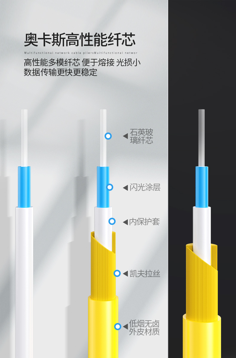 奧卡斯單模、多模 光纖 尾纖用于連接光纜,可使冷、熔等方式。 具有多種接頭形式, 光纖接頭的端面觸方式有UPC和 APC 型,可達萬兆傳輸。