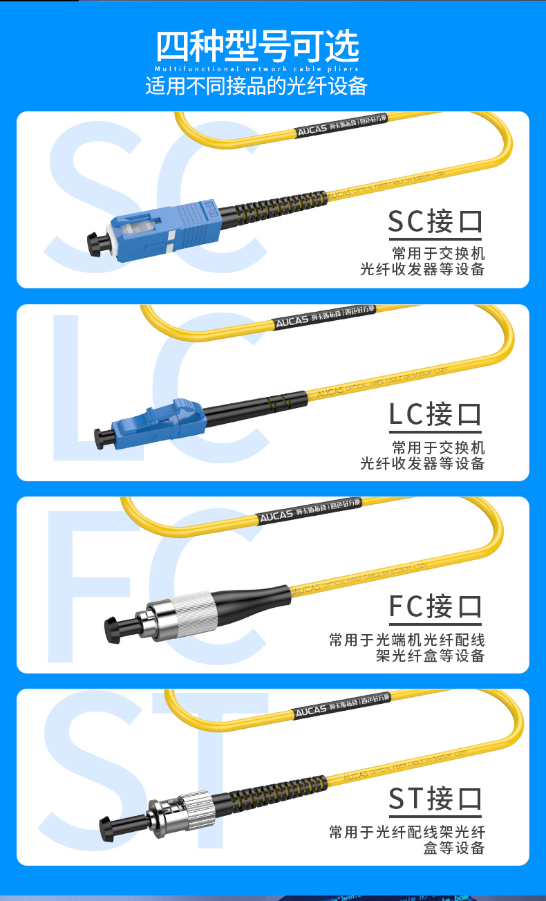 奧卡斯光纖跳線適用于LAN/WAN、數(shù)據(jù)傳輸網(wǎng)絡(luò)、圖像傳輸網(wǎng)絡(luò)、CATV、光學(xué)測試儀、光電自控系統(tǒng)