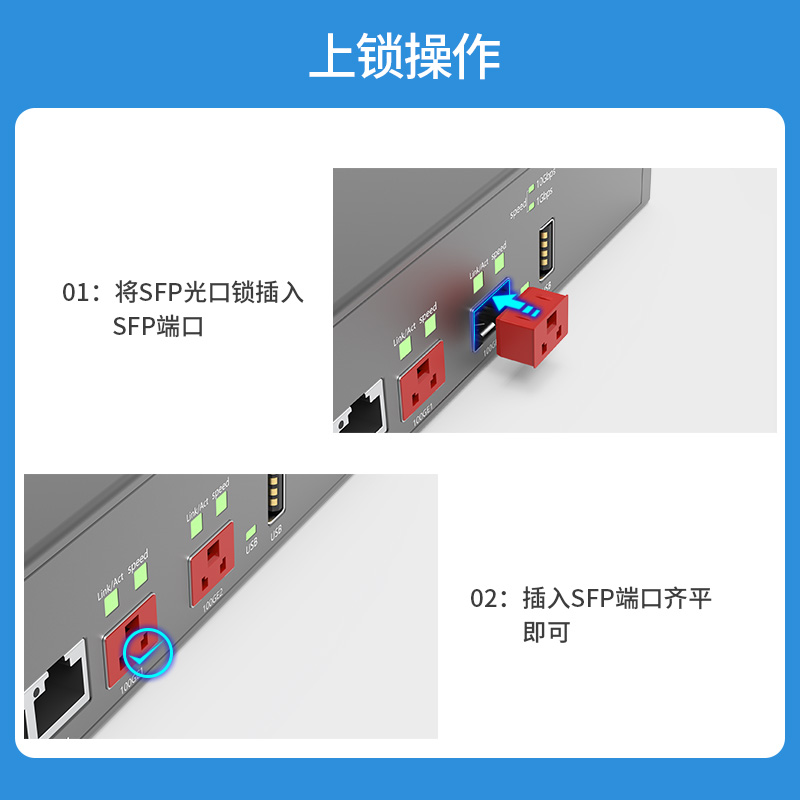 SFP端口是一種可熱拔插的輸入/輸出設(shè)備,可插入千兆以太網(wǎng)端口或者插槽,把這個端口與網(wǎng)絡(luò)連接起來。SFP網(wǎng)絡(luò)信息鎖,可以防止信息涉密和防插拔,保護網(wǎng)絡(luò)端口。適用大數(shù)據(jù)中心,大型機房。