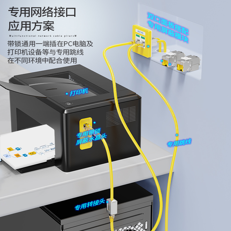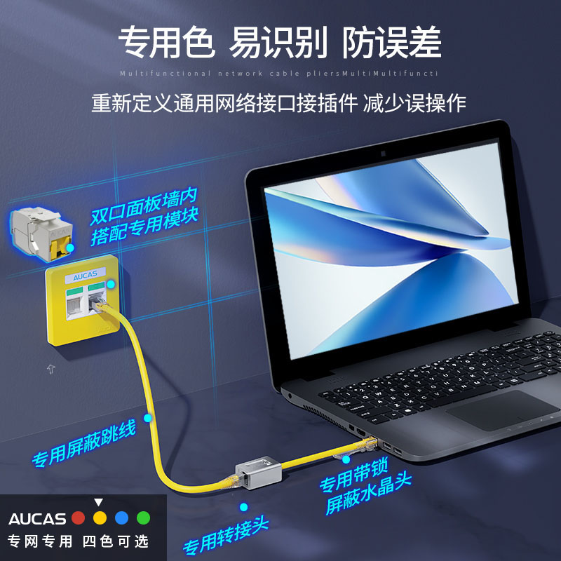 通過結構化設計調整將 RJ45 網(wǎng)絡模塊防塵蓋接口轉換成專用網(wǎng)絡接口,防止常規(guī)網(wǎng)絡跳線誤插RJ45 水晶頭搭配專用解鎖工具防止誤插拔功能,需專用解鎖工具方可取下專用網(wǎng)絡轉接頭轉接頭及連接器間線纜可提供紅、黃、藍、綠四種顏色選擇方便從顏色識別網(wǎng)絡信息系統(tǒng)