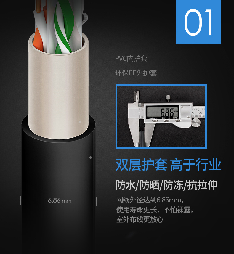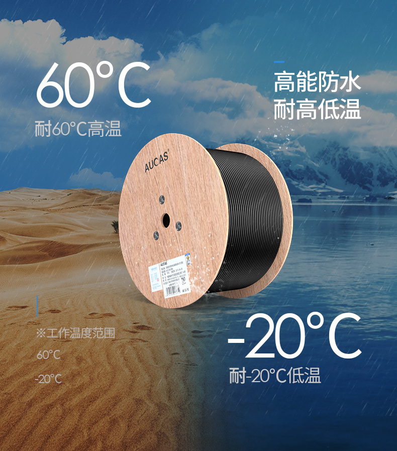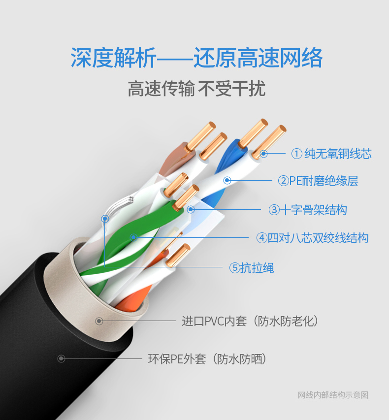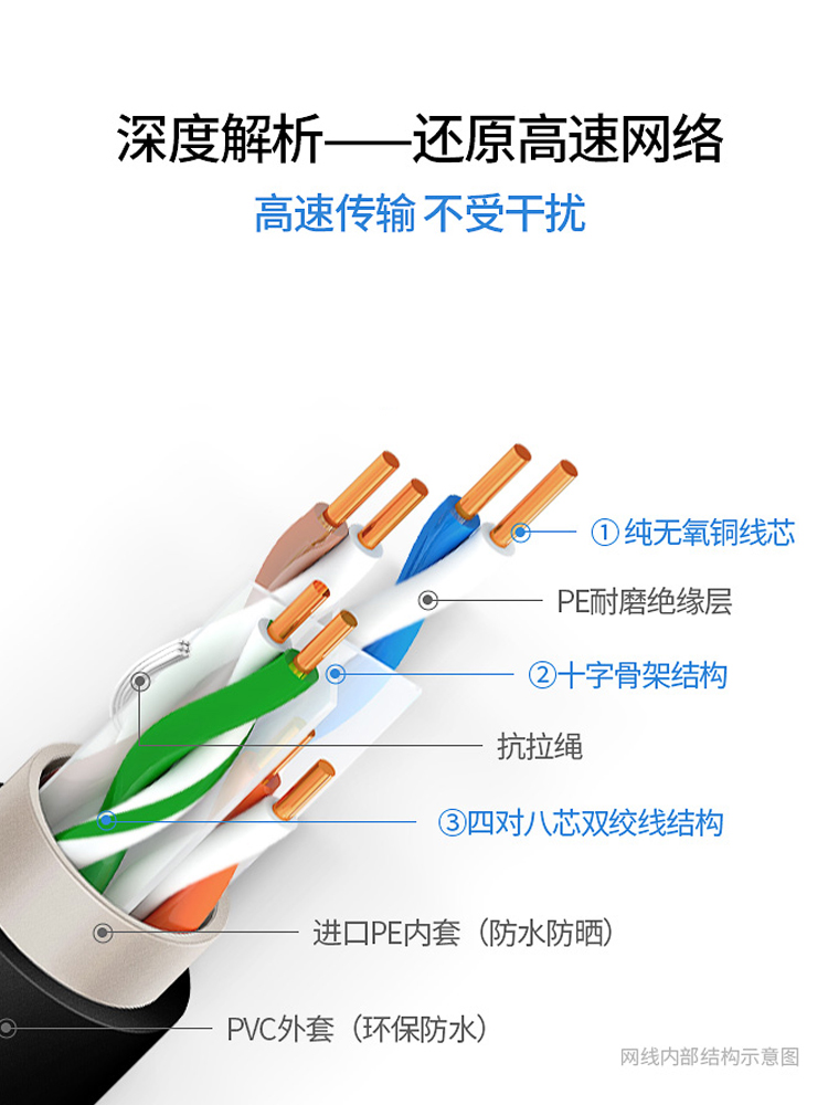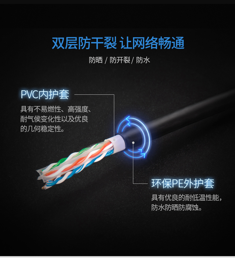 可防水,防曬,防凍。獨(dú)創(chuàng)雙向螺旋結(jié)構(gòu)線纜,傳輸性能穩(wěn)定,速率:1000Mbps,帶寬:250MHz