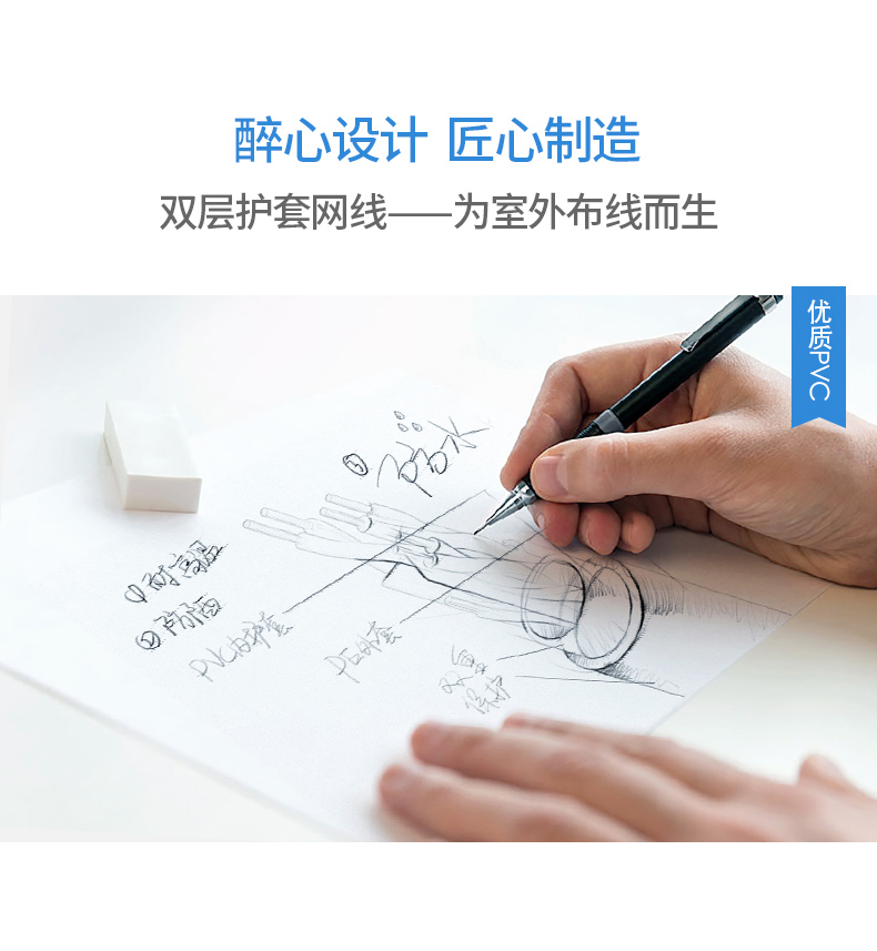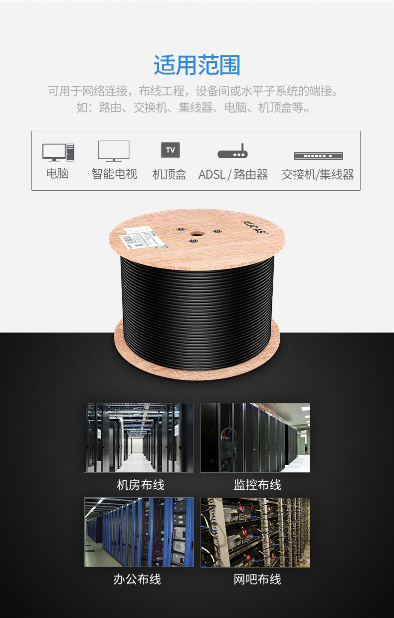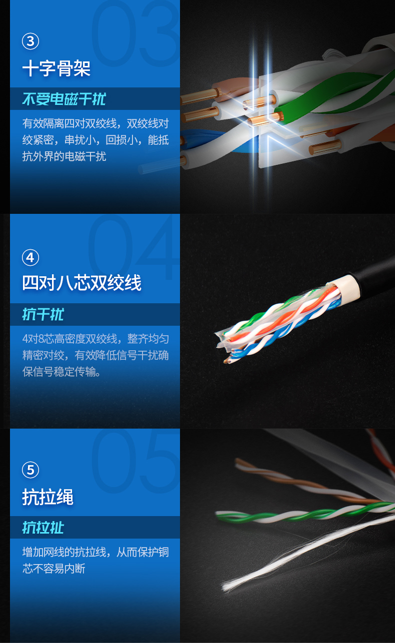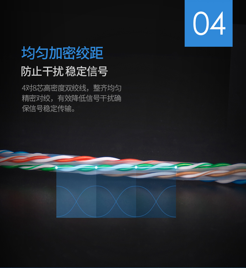 可防水,防曬,防凍。獨(dú)創(chuàng)雙向螺旋結(jié)構(gòu)線纜,傳輸性能穩(wěn)定,速率:1000Mbps,帶寬:250MHz
