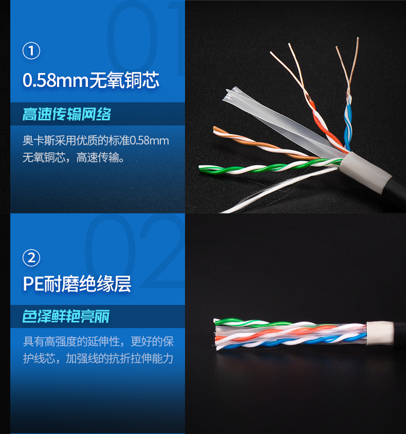奧卡斯六類非屏蔽室外網(wǎng)線結(jié)構(gòu)四對(duì)對(duì)絞方向和成纜總絞方向相反,又名雙向螺旋。更好的保護(hù)了熱脹冷縮帶來(lái)的衰減,可上期達(dá)萬(wàn)兆速率,250MHz帶寬體驗(yàn)。支持POE供電,可用于監(jiān)控布線,辦公布線,機(jī)房布線,網(wǎng)吧布線。