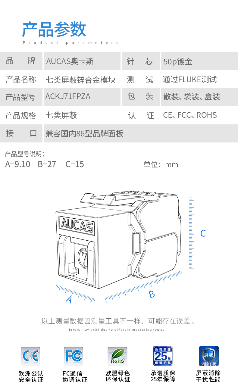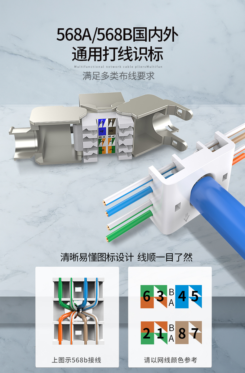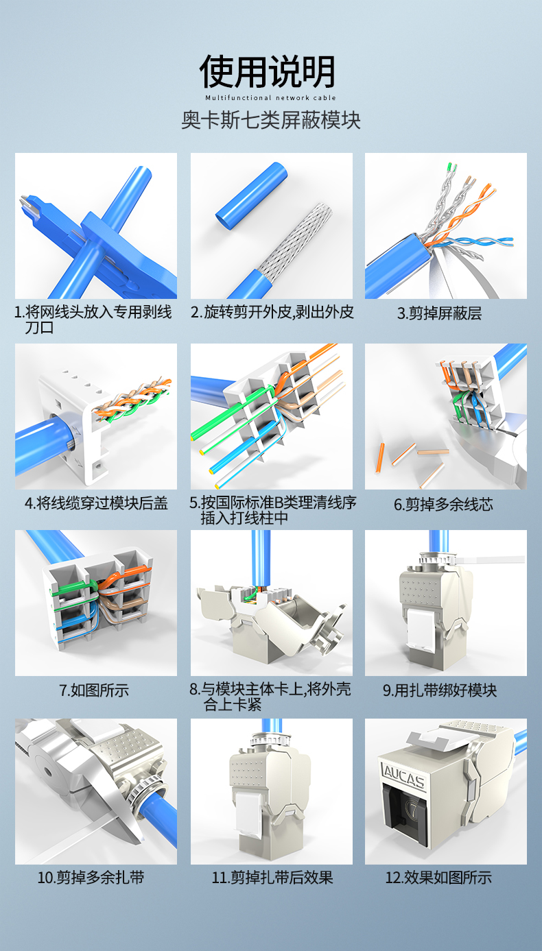 AUCAS(奧卡斯) Cat.6局域網(wǎng),傳輸語(yǔ)言、數(shù)據(jù)信號(hào),支持當(dāng)前的高帶寬應(yīng)用,可以安裝到墻面信息面板上,固定在桌面信息盒中或模塊化配線架上,并可插拔RJ11/RJ45。