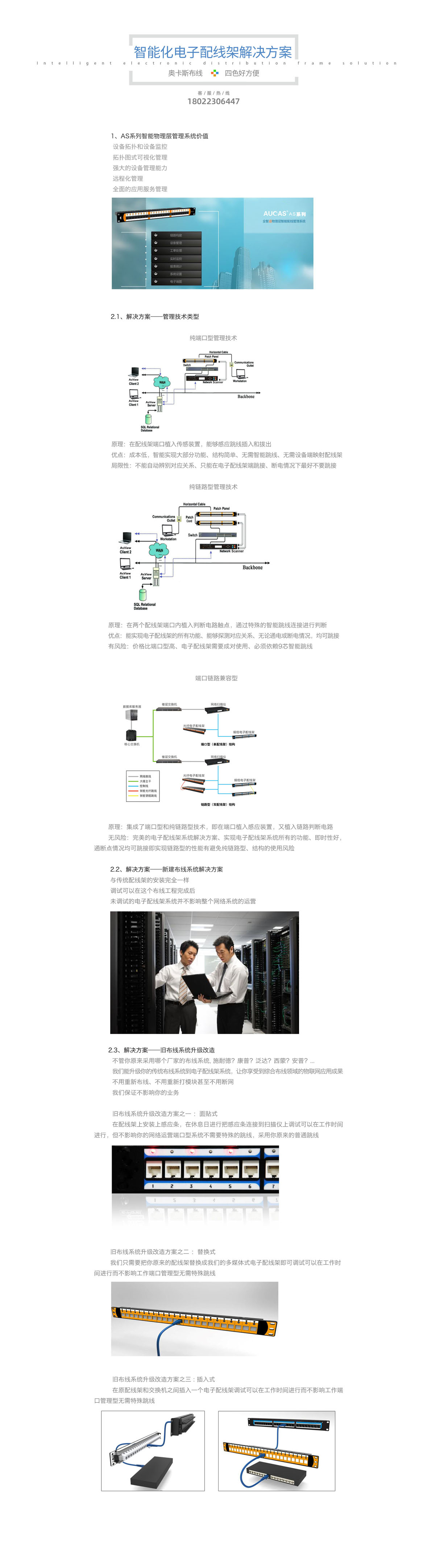 智能化電子配線架解決方案,可以在不影響現(xiàn)有業(yè)務(wù)的基礎(chǔ)上,只需把原有的配線架替換成多媒體式電子配線架即可,調(diào)試可以在工作時間進行而不影響工作端口管理,無需特殊跳線舊布線系統(tǒng)升級改造。將傳統(tǒng)布線系統(tǒng)升級到電子配線架系統(tǒng),不用重新布線,不用重新打模塊,不用斷網(wǎng),主要有面貼式、替換式、插入式三種方式。