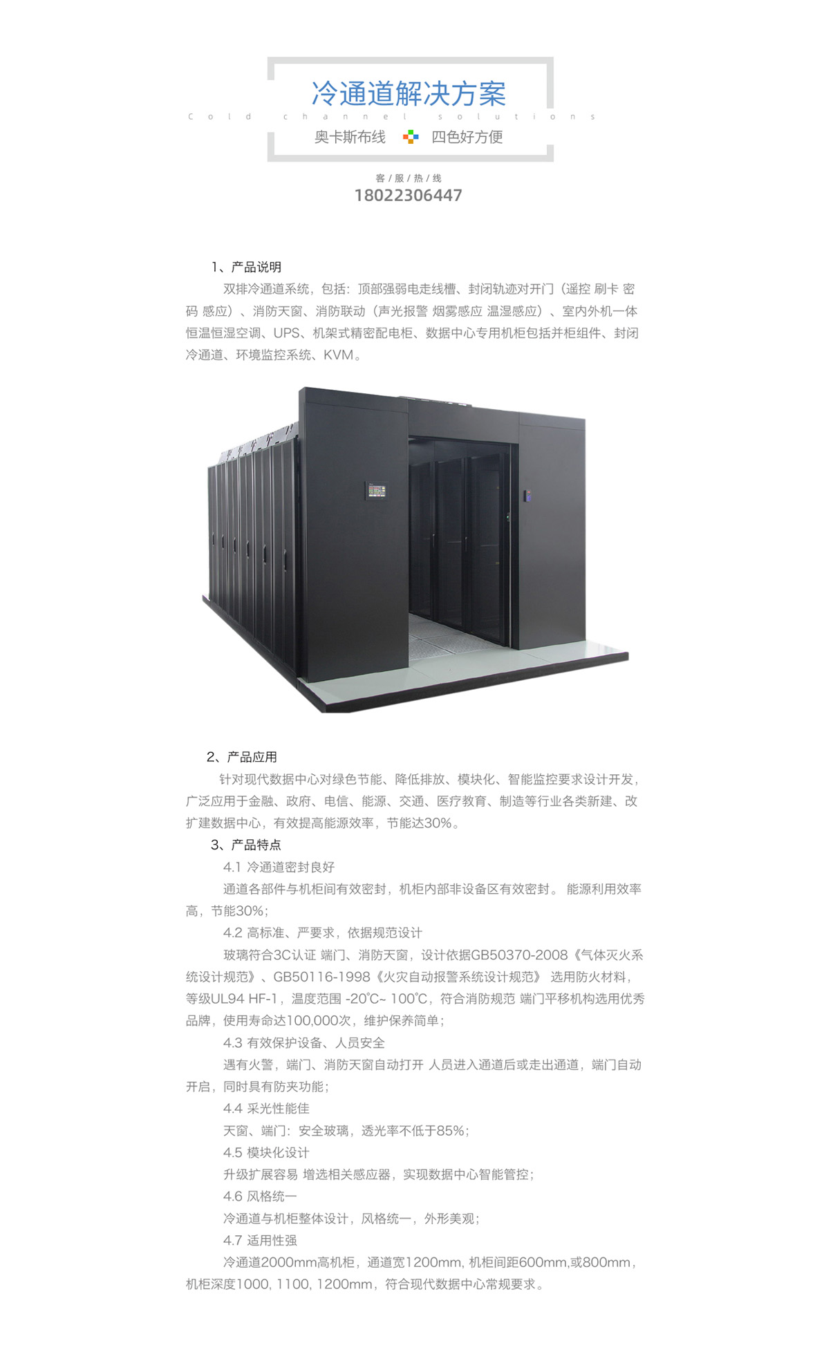 雙排冷通道系統(tǒng),包括頂部強(qiáng)弱電走線槽、封閉軌跡對(duì)開門(遙控、刷卡、密碼、感應(yīng))、消防天窗、消防聯(lián)動(dòng)(聲光報(bào)警、煙霧感應(yīng)、溫室感應(yīng))、室內(nèi)外機(jī)一體恒溫恒濕空調(diào)、UPS、機(jī)架式精密配電柜、數(shù)據(jù)中心專用機(jī)柜等。可應(yīng)用于金融、電信、能源、交通、醫(yī)療教育、制造等行業(yè)各類新建、改擴(kuò)建數(shù)據(jù)中心。